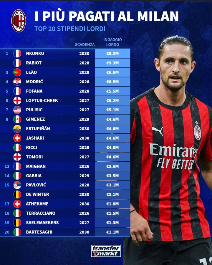 Dezhuan thống kê 20 cầu thủ có mức lương hàng năm cao nhất trong đội AC Milan. Hai cầu thủ mới của Pháp là Nkunku và Rabiot đứng đầu với mức lương hàng năm là 9,3 triệu euro, còn Leo xếp thứ ba với 6,6 triệu euro.